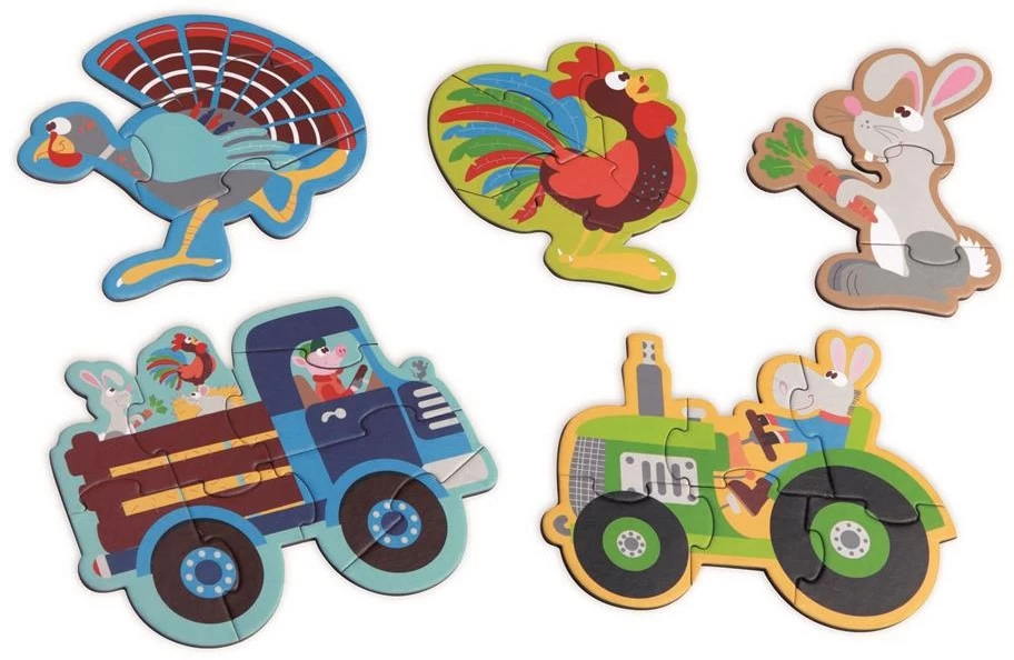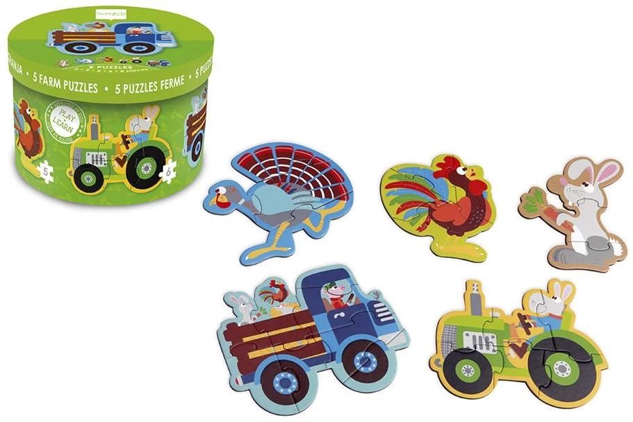 DAM Scratch Puzzle: BEGINNERSPUZZELS – FARM ca. 13-19cm, mit 5 Puzzles 3-4-5-6-8 Teile, in Karton, in Box diam.18xH12cm, 2+
