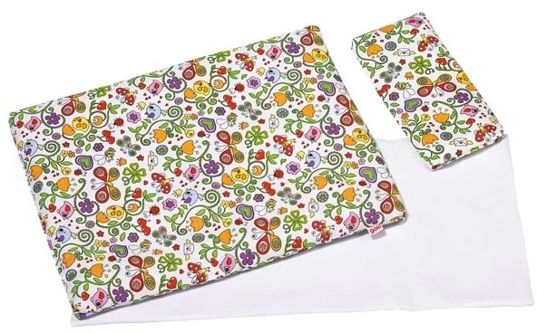 Das fröhlich-bunte Puppenbettzeug passt in alle Puppenbetten und -wiegen. Kopfkissen 22 x 10 cm, Oberbett 41 x 31 cm, Unterbett 54 x 25 cm