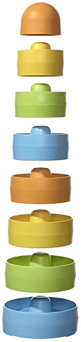 Der bunte Stapelturm ist aus recyceltem Kunststoff. 8 verschiedenfarbige Bauteile mit runden Kanten, die in beliebiger Reihenfolge ineinander passen.
