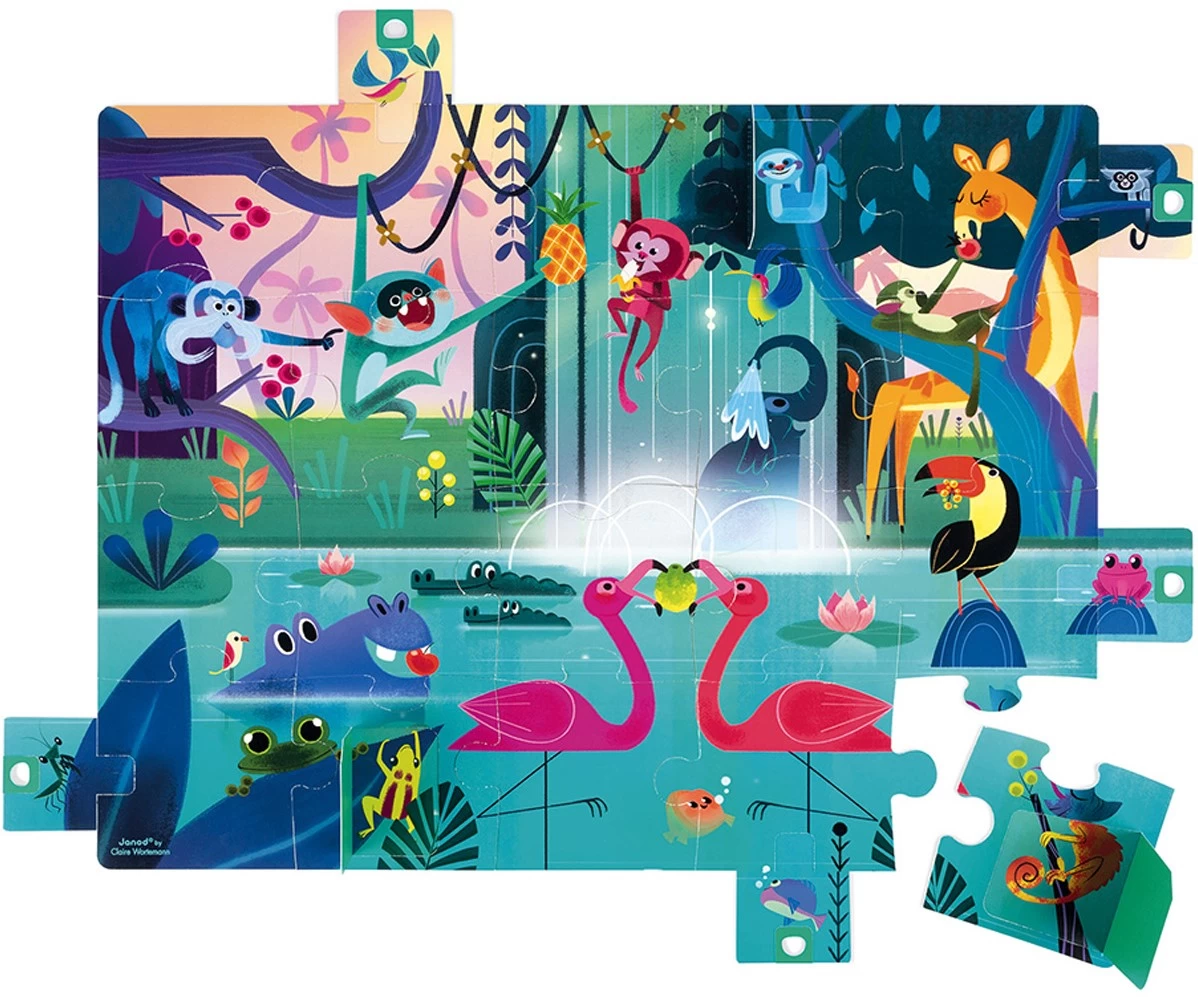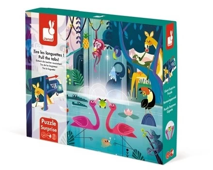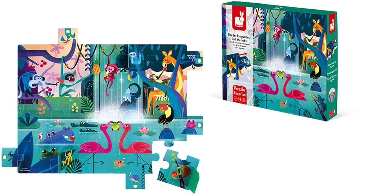20-teiliges Riesenpuzzle aus fester Pappe mit 8 Überraschungsteilen! 5 Zuglaschen zum Vergrößern des Puzzles und 3 Fenster zum Öffnen und Entdecken vieler verborgener Überraschungen in den Illustrationen. Aber wo ist das Faultier versteckt? Welches Insekt versteckt sich auf seinen Blättern? Hast du gesehen, wie das Chamäleon, die Farbe wechselt? Illustrationen in sanften Farben zum Thema Dschungeltiere. Geeignet für Kinder im Alter von 2-4 Jahren. Verpackt im Karton. Mit Poster