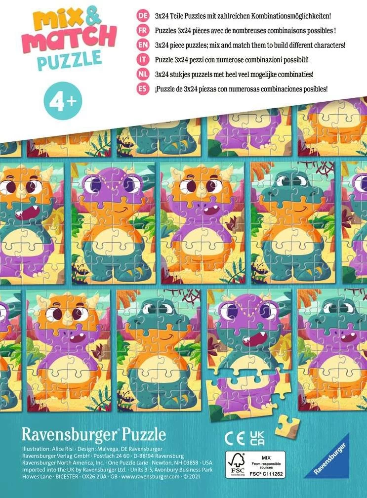 Puzzeln nach dem Prinzip Mix&Match: Puzzle legen, Teile austauschen und zu neuen Motiven kombinieren! Mit den immer wieder neuen Kombinationen der Puzzlesegmente wird spielerisch die Fantasie der Kinder angeregt und die Wahrnehmung geschult. Ganz nebenbei verbessern sich auch die Auge-Hand-Koordination und die Geduld. Puzzles mit der richtig gewählten Schwierigkeit lassen die Kinder an der Herausforderung wachsen, stärken ihr Selbstbewusstsein und machen vor allem richtig viel Spaß. In der großen Auswahl von Ravensburger Kinderpuzzles mit den beliebtesten Motiven, von 2 Teilen bis 300 Teilen, ist garantiert für jedes Kind das richtige Puzzle dabei. Die Unbedenklichkeit aller verwendeten Materialien wird von einem unabhängigen Institut bestätigt. Seit mehr als 100 Jahren entwickeln wir Puzzles, wie Kinder sie lieben: altersgerecht in Motiv, Teilezahl und -größe.