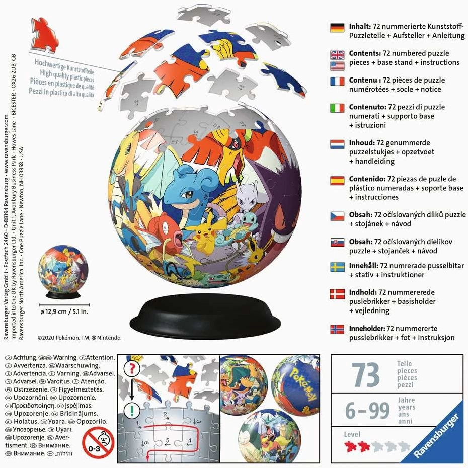 Aus gewölbten Kunststoff-Puzzleteilen, die dank EasyClick Technology perfekt zusammen passen, entsteht Stück für Stück dieser stabile 3D Puzzle-Ball, ganz ohne Kleben. Die Nummerierung der Teile auf der Rückseite erleichtert das Vorsortieren und ermöglicht einfaches Puzzeln nach Zahlen.